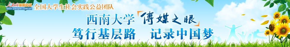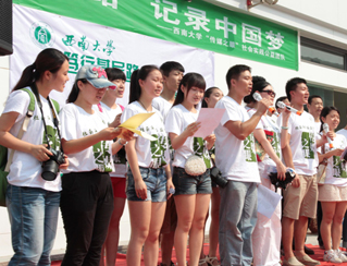 西南大學“傳媒之眼”社會實踐隊由新聞傳媒學院團委老師李海峰、范曦帶隊,8名研究生、19名本科生組成。團隊圍繞“篤行基層路,記錄中國夢”的主題,自7月3日開始,從建設生態(tài)北碚、“百姓中國夢”主題宣講、“幸福重慶”人文記錄、“山城百姓”社會調(diào)查四個方面開展活動。團隊已經(jīng)在歇馬鎮(zhèn)碚青路中心廣場舉行了文藝匯演,并給群眾帶來了各種各樣的避暑藥品;到歇馬污水處理廠,了解當?shù)厣a(chǎn)生活污水的處理;到重慶歇馬機械曲軸有限公司,宣傳“節(jié)能生產(chǎn)”理念,在員工中開展環(huán)保培訓,強調(diào)可持續(xù)生產(chǎn)和發(fā)展。