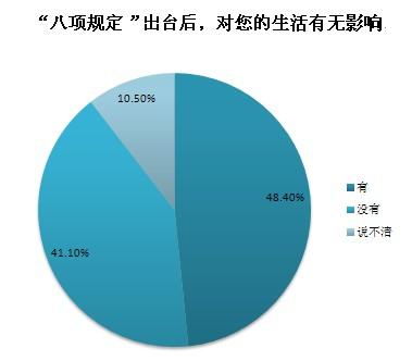 截至2013年12月20日10時(shí),共收到網(wǎng)絡(luò)問(wèn)卷2442份,48.4%的受訪者認(rèn)為“八項(xiàng)規(guī)定”對(duì)個(gè)人生活有影響,其中公務(wù)員群體認(rèn)為“八項(xiàng)規(guī)定”帶來(lái)的最大影響是“公務(wù)吃請(qǐng)少了,能抽出更多時(shí)間陪伴家人”和“津貼補(bǔ)貼獎(jiǎng)金少了,勒緊褲帶過(guò)日子”,非公務(wù)員群體認(rèn)為“八項(xiàng)規(guī)定”帶來(lái)的最大影響是“酒店、高端會(huì)所門(mén)外的公務(wù)用車(chē)少了”和“遇到領(lǐng)導(dǎo)考察工作時(shí),地毯鮮花迎送領(lǐng)導(dǎo)的情況少了”。