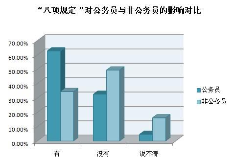 “八項(xiàng)規(guī)定”出臺(tái)后,對(duì)您的生活有無(wú)影響?”針對(duì)這一題,48.4%的受訪者選擇“有影響”,41.1%選擇“無(wú)影響”,10.5%“說(shuō)不清”。從調(diào)查結(jié)果來(lái)看,“八項(xiàng)規(guī)定”對(duì)公務(wù)員群體的影響大于非公務(wù)員群體,受訪者中分別有62.8%的公務(wù)員和34.4%的非公務(wù)員選擇了“有影響”,前者比后者多28.4%。但是,回答“說(shuō)不清”的比例,后者(16.2%)高于前者(4.6%),表明普通民眾相比于公務(wù)員對(duì)“八項(xiàng)規(guī)定”是否影響個(gè)人生活的認(rèn)知相對(duì)模糊。