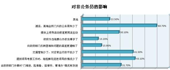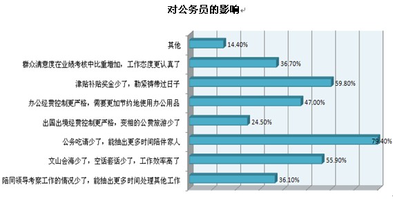 還有三到五成受訪公務(wù)員認(rèn)為“辦公經(jīng)費(fèi)控制更嚴(yán)格,需要更加節(jié)約地使用辦公用品”、“群眾滿意度在業(yè)績(jī)考核中比重增加,工作態(tài)度更認(rèn)真了”和“陪同領(lǐng)導(dǎo)考察工作的情況少了,能抽出更多時(shí)間處理其他工作”是“八項(xiàng)規(guī)定”帶來(lái)的幾大影響。