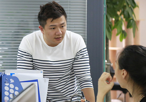 陳一冰在公司里與同事交流(代睿攝)