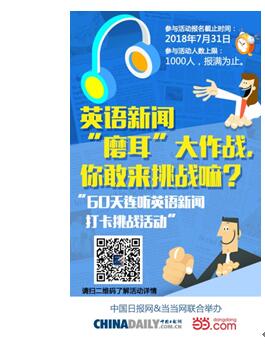 2018這個夏天,中國日報網(wǎng)攜手當當網(wǎng)推出首期“60天連聽英語新聞打卡達人活動”,你不僅能通過中國日報網(wǎng)外籍專家的純正英音、美音了解每天世界上的精彩趣聞,還可以考驗自己的毅力和自律性。60個工作日,三個月的時間,看似很短,但是你的努力,時間看得到!跟上我們這60天的步伐,相信您的英語能力會日益精進。