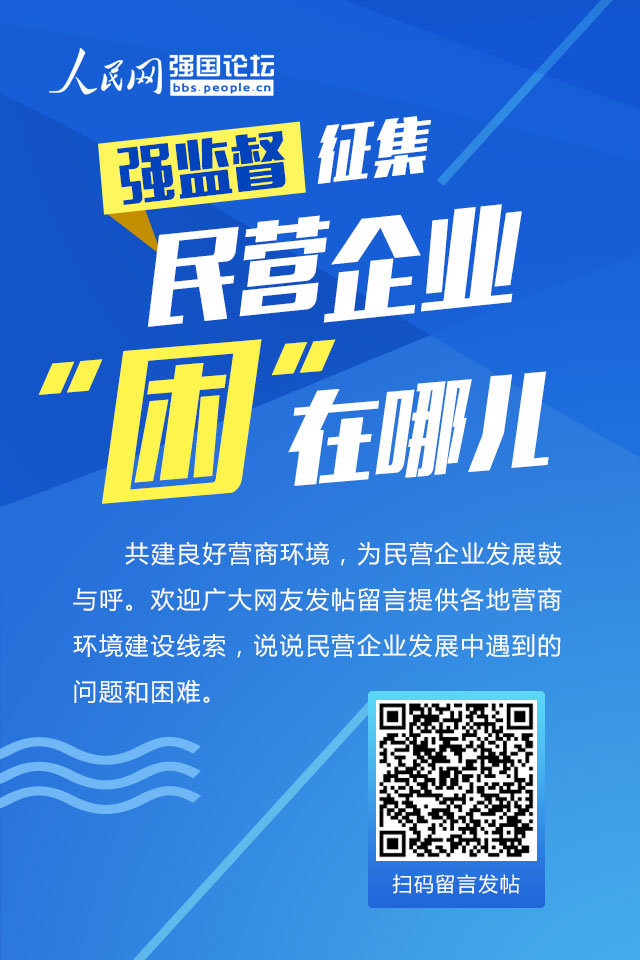 共建良好營商環(huán)境,為民營企業(yè)發(fā)展鼓與呼,人民網(wǎng)強國論壇開設(shè)“專項監(jiān)督”版塊,歡迎廣大網(wǎng)友發(fā)帖留言提供各地營商環(huán)境建設(shè)線索,說說民營企業(yè)發(fā)展中遇到的問題和困難,以期共同推動“糾正一些政府部門、大企業(yè)利用優(yōu)勢地位以大欺小、拖欠民營企業(yè)款項的行為”,為民營經(jīng)濟發(fā)展創(chuàng)造健康環(huán)境。