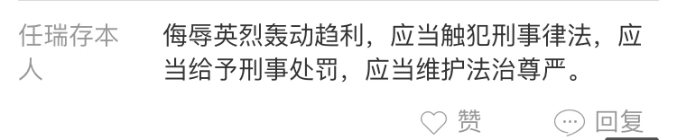 強(qiáng)國論壇網(wǎng)友“任瑞存本人”:侮辱英烈轟動(dòng)趨利,實(shí)屬惡意踐踏正義,須要受到法治懲戒,須要接受道德警示。