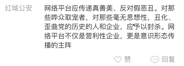 網(wǎng)友“紅城公安”:網(wǎng)絡(luò)平臺(tái)不僅是營利性企業(yè),更是意識(shí)形態(tài)傳播的主陣地,應(yīng)拿出基本責(zé)任感,傳播國家和民族的優(yōu)秀文化傳統(tǒng)。