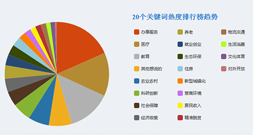 圍繞群眾關(guān)切,本次征集活動共設(shè)置了20類話題。辦事服務(wù)、醫(yī)療、教育是網(wǎng)友關(guān)注的重點,位居話題榜前三位。科研創(chuàng)新、農(nóng)業(yè)農(nóng)村、社會保障、養(yǎng)老、經(jīng)濟(jì)政策、生態(tài)環(huán)保、住房分列四到十位。