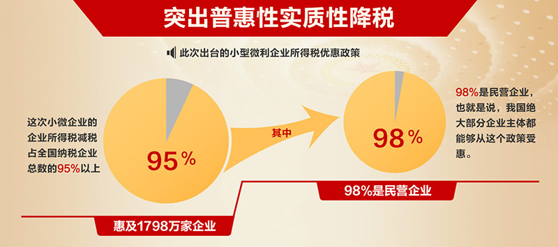 張連起:提高增值稅小規(guī)模納稅人起征點(diǎn),放寬小型微利企業(yè)標(biāo)準(zhǔn)并加大優(yōu)惠力度。這比原來(lái)認(rèn)定的標(biāo)準(zhǔn)有大幅度的提升,也就是說(shuō)有更多的企業(yè)會(huì)被認(rèn)定為小型微利企業(yè)。據(jù)測(cè)算,認(rèn)定為小型微利企業(yè)戶數(shù)1798萬(wàn)戶,占全部納稅企業(yè)的比重超過(guò)95%,其中98%是民營(yíng)企業(yè)。也就是說(shuō),我國(guó)絕大部分企業(yè)主體都能夠從這個(gè)政策中受惠。