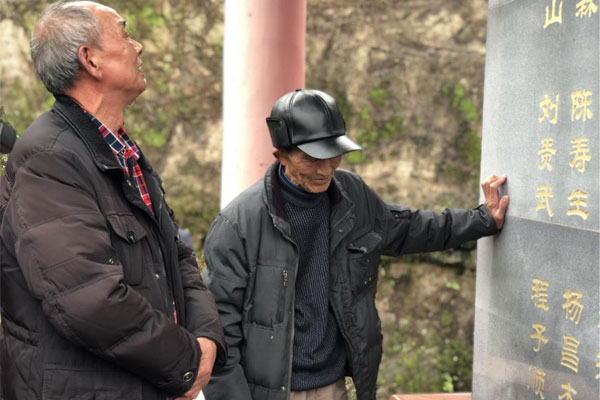 二處老職工周勝才(左)、蒲祖厚(右)在枝柳鐵路烈士紀(jì)念亭悼念老戰(zhàn)友。 人民網(wǎng)記者 張葳攝