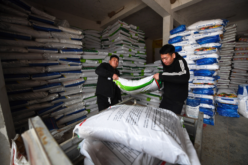 2月8日,河南商丘寧陵縣農(nóng)民將購買的化肥運到三輪車上。新華社記者 張浩然攝